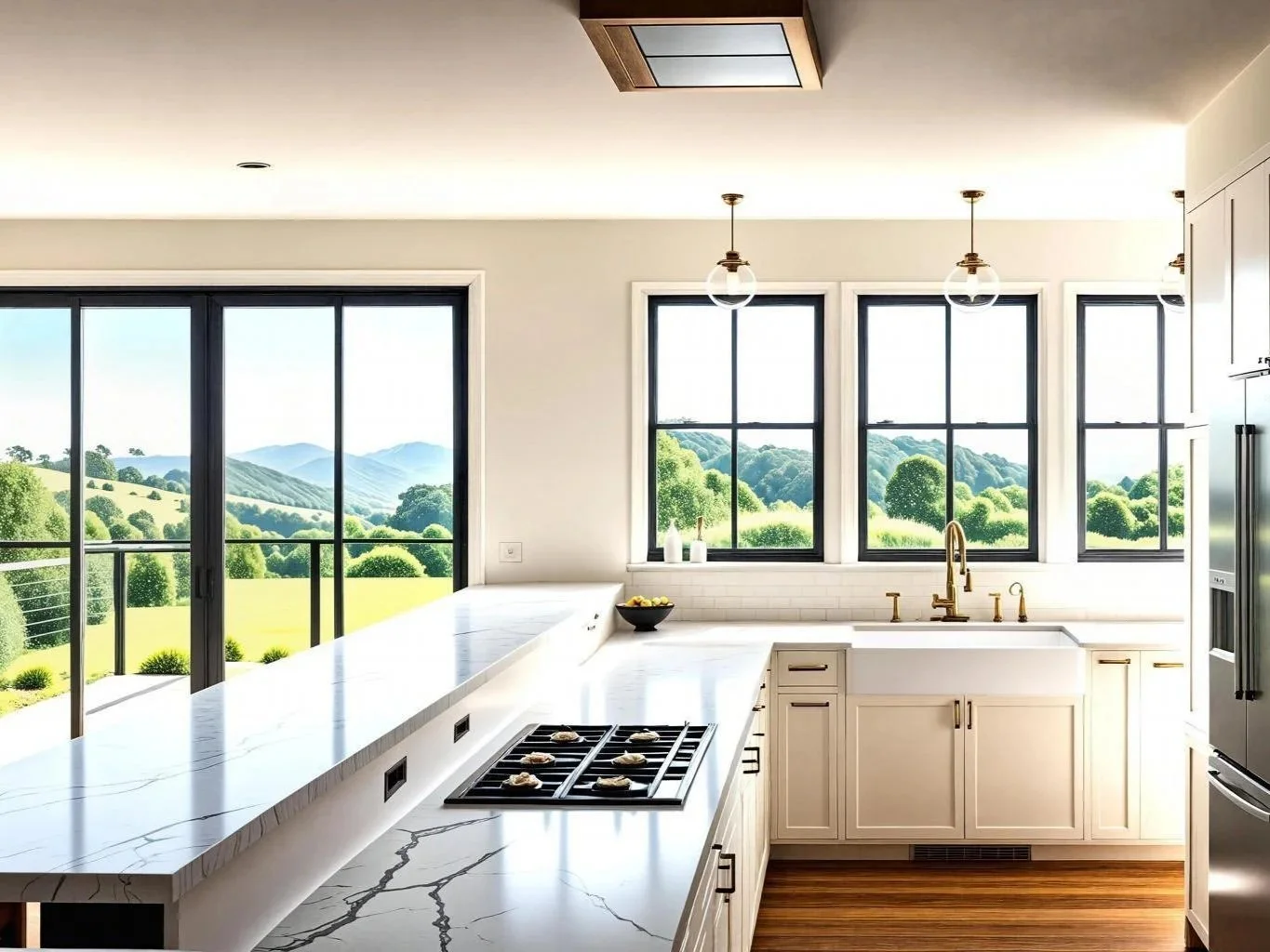 Large glass apertures on the western façade not only frame the breathtaking valley views but also dissolve the boundaries between indoor comfort and nature’s immensity. This deliberate design choice fosters an ambient relationship with the environment, providing ample natural light and inviting the vibrant outdoor landscape into daily life.
